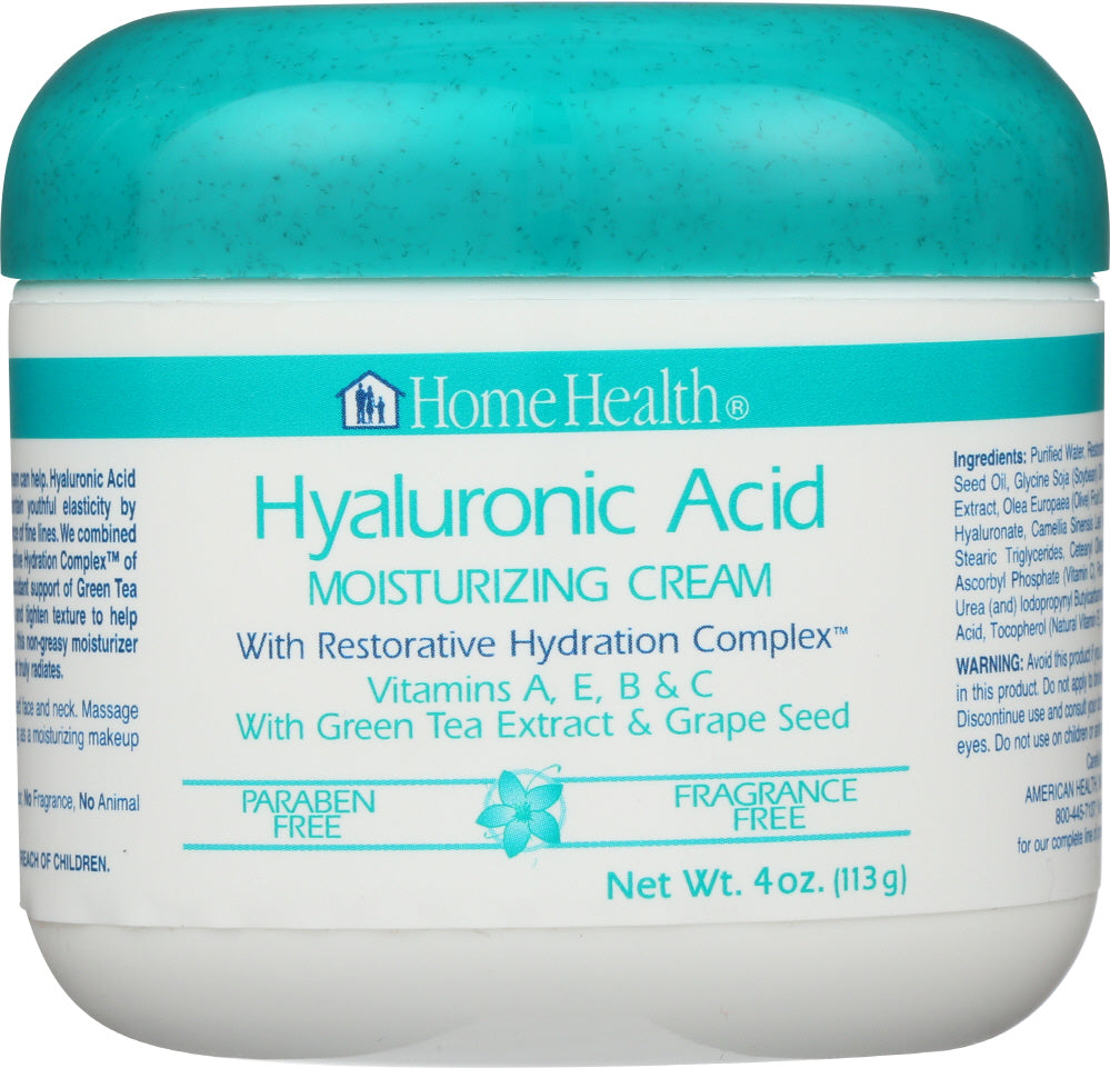 Description With Restorative Hydration Complex Vitamins A, E, B & C With Green Tea Extract & Grape Seed Paraben Free Fragrance Free For healthier-looking skin, Hyaluronic Acid Moisturizing Cream can help. Hyaluronic Acid is naturally found in the skin, where it helps to maintain a more youthful elasticity by trapping skin's moisture, which may help reduce the appearance of fine lines and wrinkles. We combined natural Hyaluronic Acid with specially formulated Restorative Hydration Complex of nourishing skin-enhancing botanicals along with the antioxidant protection of Green Tea Extract and Grape Seed Oil. Rejuvenating vitamins firm and tighten texture to replenish skin's natural radiance. Gentle for all skin types, this non-greasy moisturizer absorbs quickly into the skin for a beautiful complexion that truly radiates. Other Ingredients Purified water, restorative hydration complex [vitis vinifera (grape) seed oil, glycine soja (soybean) oil (and) chamomilla recutita (matricaria) flower extract, olea europaea (olive) fruit oil, aloe barbadensis leaf extract, sodium hyaluronate, camellia sinensis (green tea) extract], caprylic/capric/myristic/stearic triglycerides, cetearyl olivate (and) sorbitan olivate, glycerin, sodium ascorbyl phosphate (vitamin C), panthenol (vitamin B5), dimethicone, diazolidinyl urea (and) iodopropynyl butylcarbamate, sodium magnesium silicate, bisabolol, citric acid, d-alpha tocopherol (natural Vitamin E), disodium EDTA, retinyl palmitate (Vitamin A). No parabens, no petroleum, no artificial color, no fragrance, no animal products, no gluten. Unconditionally guaranteed. Warnings Apply a small amount to a thoroughly cleansed face and neck. Massage into skin using gentle, upward strokes. Use in the morning as a moisturizing makeup base; at night as a nourishing night cream.
