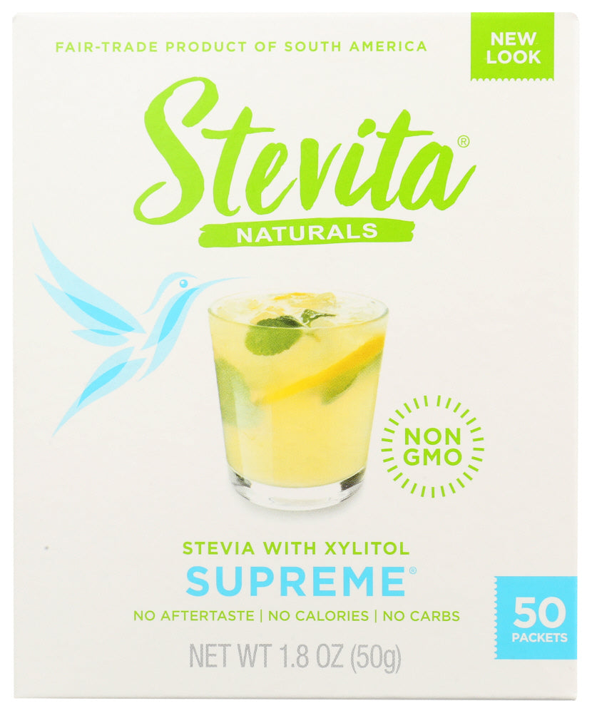 Our stevia is grown on our farms in Brazil and is USDA Certified Organic, then blended with xylitol (a natural filler derived from fruits, grains and vegetables). One packet of Supreme is equal to 3 packets of sugar in sweetness. No other ingredients or flavors are added, just a natural sweet taste!