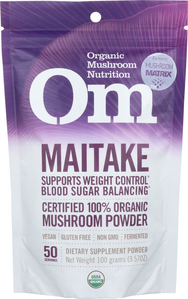 Om Maitake Organic Mushroom Powder naturally contain: beta glucans, prebiotics, digestive enzymes, antioxidants, amino acids, proteins, peptides, lectins, polyphenols, flavonoids, selenium compounds and other myconutrients. Optimize your body with full spectrum potency. Balance your blood sugar and insulin levels with this remarkable well-researched mushroom. Supports weight control and digestion in conjunction with dietary restriction and exercise. This unflavored dietary supplement powder is Certified 100% Organic, vegan, gluten free, non-GMO, Kosher, and raw. It does not contain artificial ingredients or fillers and is grown in the USA.