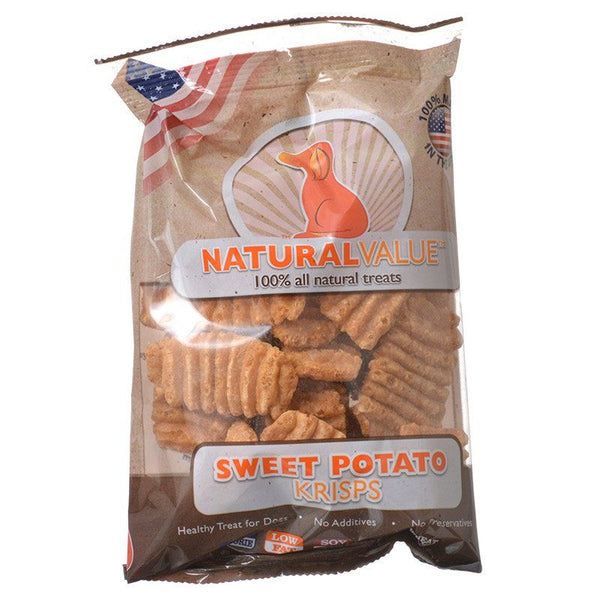 Natural Value Sweet Potato Krisps are 100% all natural, USA-made healthy dog treats, made with just 2 wholesome ingredients so you can reward your pooch with zero guilt! These tasty, crunchy biscuits are low in fat and calories and contain no wheat, soy, gluten or additives.