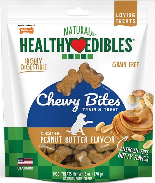 Nylabone Natural Healthy Edibles Peanut Butter Chewy Bites Dog Treats are grain-free, natural dog treats with no artificial preservatives. Featuring nutty allergen-free peanut butter flavor your four-legged friend loves, these soft and chewy snacks for dogs make perfect treats for training and rewarding. These loving treats are also highly digestible and help support your dogs digestive system to promote overall health. Created with care, these wholesome dog treats are perfect for dogs of all sizes and proudly made in the USA!