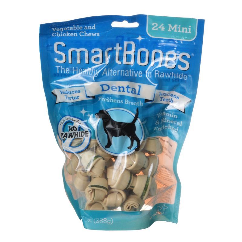 These dog chew bones are also fortified with vitamins and minerals and are over 99% digestible -- something other rawhide chews can't offer. Tests also show that 9 out of 10 dogs prefer SmartBones to leading rawhide chews. Keep your dog happy and healthy with these dental treats that help remove tartar and plaque buildup and satisfy your dogs natural urges to chew. Dental flavor contains chlorophyll and parsley seed oil for additional dental benefits.