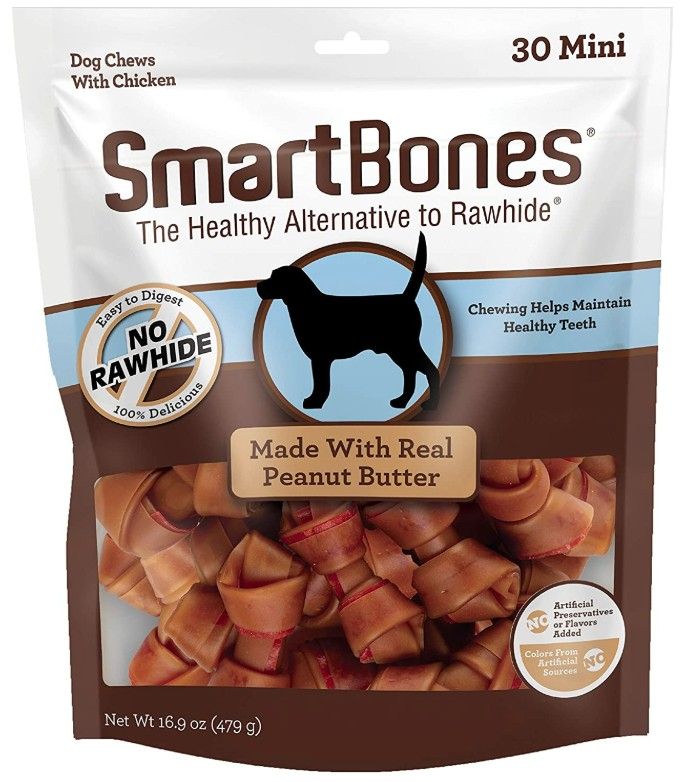 SmartBones chews have all the benefits of a rawhide chew without the rawhide! No-rawhide SmartBones chews are made with real chicken and peanut butter for a scrumptious taste dogs can't resist. Giving your dog a treat that you both can love just got a whole lot easier! Made with delicious ingredients like real chicken and peanut butter, these SmartBones With Peanut Butter mini chews are sure to be a new favorite for your dog. A healthy alternative to rawhide, these chews are easy to digest and 100 percent delicious. SmartBones chews provide great taste in a bone-shaped treat for both fun and flavor. These rawhide-free chews are vitamin and mineral enriched. Chewing helps maintain healthy teeth. Contains 30 mini chews your dog will love. Feed your dog 1 to 2 chews per day. Always supervise your pup during chewing activity. These chews are intended for intermittent or supplemental feeding only. Select a chew slightly larger than your pets mouth. Store in a cool, dry place. After opening, reseal, or store in an airtight container to preserve freshness. Always provide plenty of fresh drinking water and visit your veterinarian regularly.